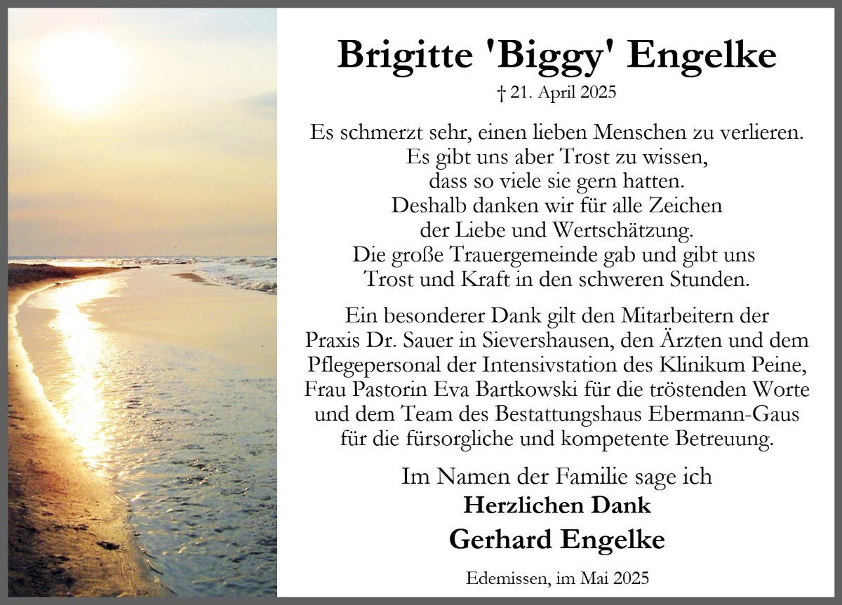 Lieber Gert, Susi, Jan, Jürgen, Anke und rest der Familie und Freunde. Mit tiefen Bedauern haben wir von Tod unserer lieben Tante Biggi erfahren. Auch wenn wir weit entfernt in Südafrika sind, sind unser Gedanken und Herzen bei Euch in dieser schweren Zeit. Wir werden sie in liebervoller Erinnerung behalten und wünschen Euch viel Kraft und Trost in dieser schweren Zeit. Viele liebe Grüsse von Hermann, Maritha, Nina und Anja.