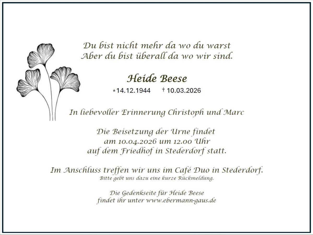 Sprechen Sie im Kondolenzbuch den Hinterbliebenen Ihr Beileid aus und teilen Sie persönliche Gedanken und Erinnerungen mit anderen.