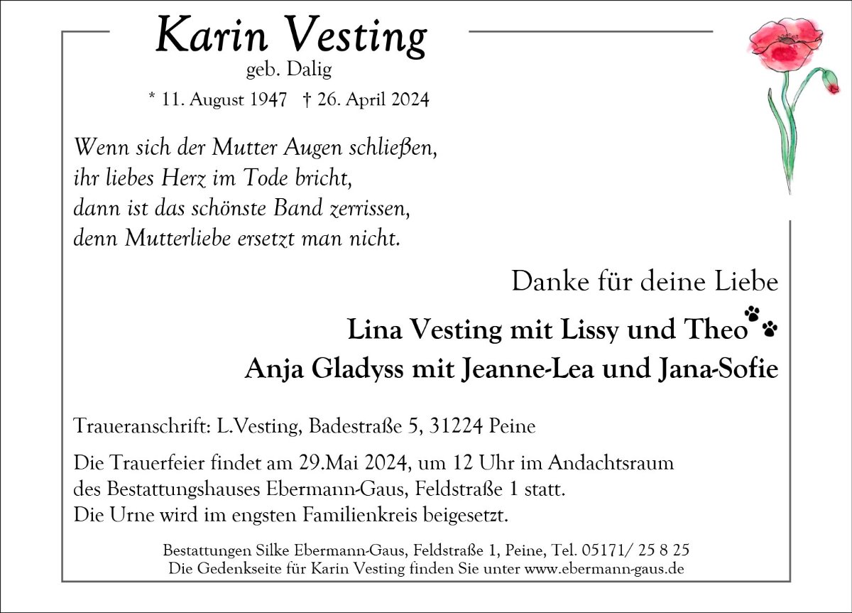 Karin Vestinggestorben am 26. April 2024