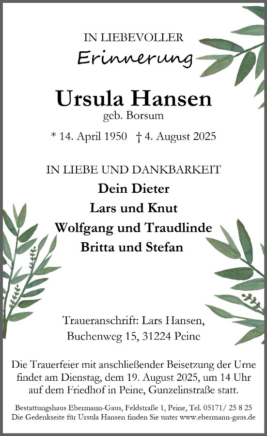 Trauerfeier mit anschließender Beisetzung der Urne, Friedhof Peine-Gunzelinstraße