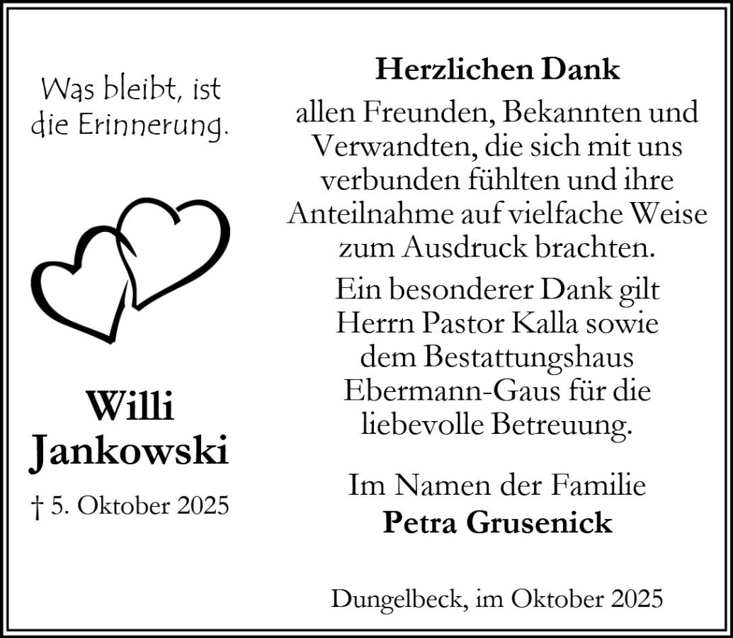 In Gedenken an meinen Onkel Willibald Jankowski Dunkelbeck mein Beileid Neffe